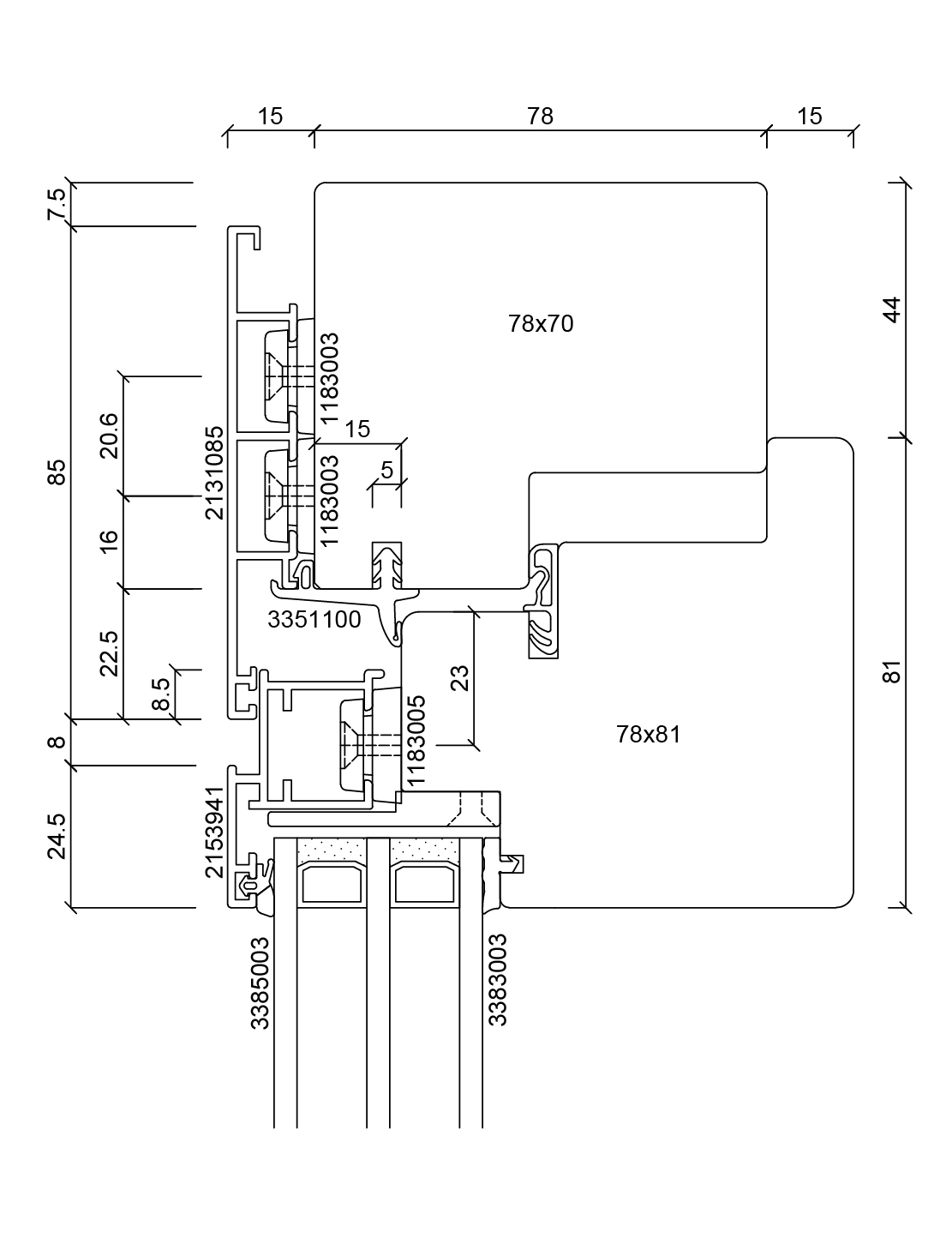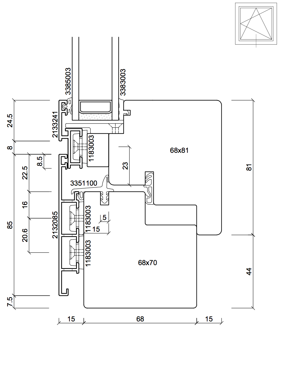 Rahmenprofil und Flügelprofil bilden eine flächenbündige Ebene. Zwischen Glas und Flügelprofil besteht ein Versatz von 8 mm Tiefe. Die Ansichtsbreite des sichtbaren Flügelprofils beträgt 33 mm. Bei bestimmten statischen Anforderungen kann das Flügelprofil breiter ausgeführt werden. Die Entwässerung des Falzbereiches erfolgt durch verdeckte Stanzungen im unteren Profilquerstück des Rahmens. Optional kann eine sichtbare Entwässerung mit Abdeckkappe ausgeführt werden.