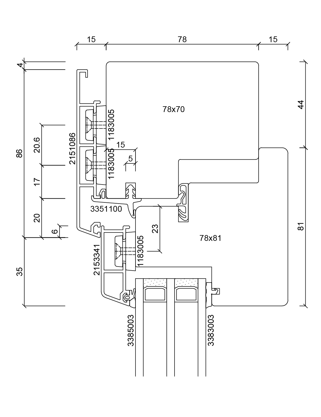 Rahmenprofil und Flügelprofil bilden eine flächenversetzte Ebene. Zwischen Glas und Flügelprofil besteht ein Versatz von 18 mm Tiefe. Die Ansichtsbreite des sichtbaren Flügelprofils beträgt 35 mm und verläuft schräg zur Glasebene. Bei bestimmten statischen Anforderungen kann das Flügelprofil breiter ausgeführt werden. Die Entwässerung des Falzbereiches erfolgt durch verdeckte Stanzungen im unteren Profilquerstück des Rahmens. Optional kann eine sichtbare Entwässerung mit Abdeckkappe ausgeführt werden.