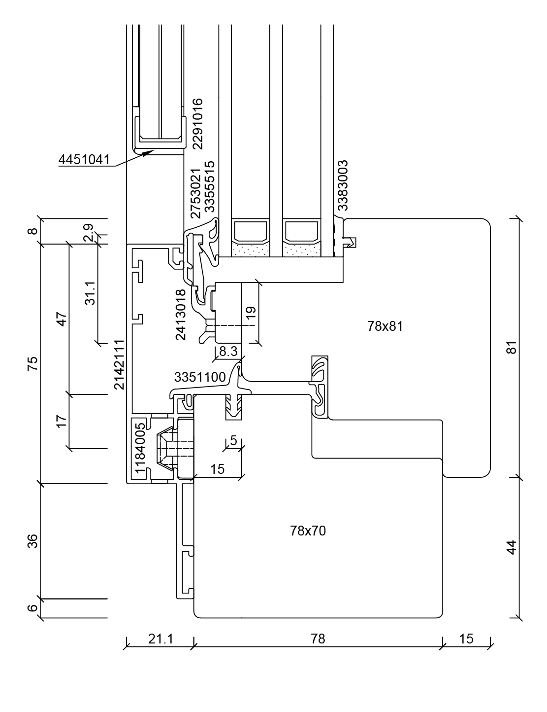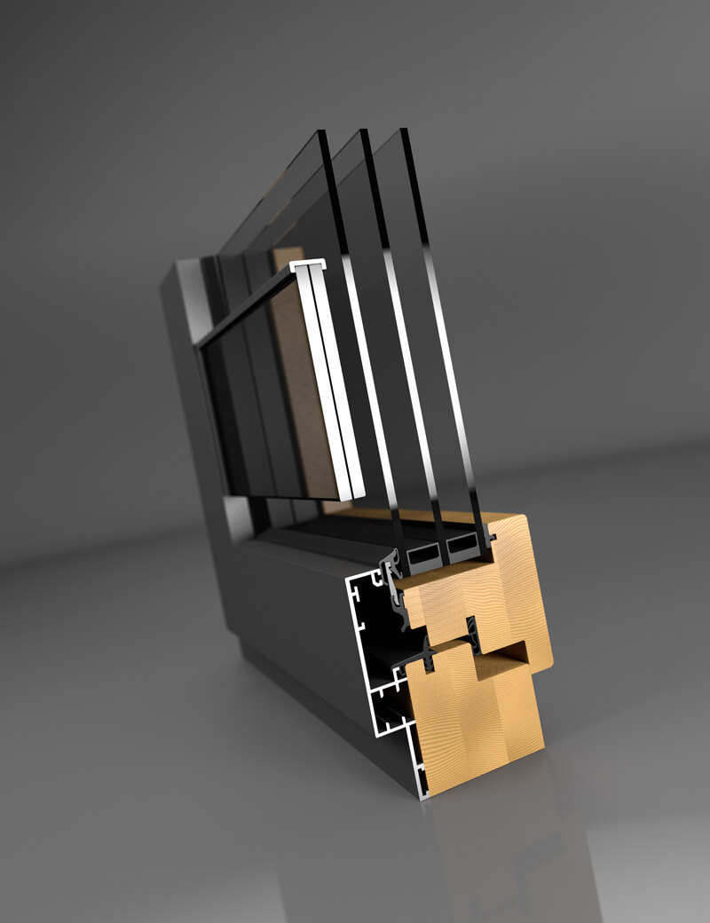 Das Rahmenprofil verdeckt das Flügelprofil soweit, dass zwischen Festverglasungen und Öffnungselemente eine gleiche Rahmenansicht entsteht. Zwischen Glas und Flügelprofil besteht ein Versatz von 8 mm Tiefe. Die Konstruktion ist als Integralflügel oder Blockflügel definiert. Bei bestimmten statischen Anforderungen kann das Flügelprofil breiter ausgeführt werden. Die Entwässerung des Falzbereiches erfolgt durch verdeckte Stanzungen im unteren Profilquerstück des Rahmens. Optional kann eine sichtbare Entwässerung mit Abdeckkappe ausgeführt werden. Die Eckverbindungen der Aluminium-Rahmen werden in geschweißter Form ausgeführt. Integrierte Glasabsturzsicherung unsichtbar befestigt im Aluminium-Rahmen. Die Integration der Glasscheibe in den Alurahmen erfolgt durch eine Systemfräsung. Die Glasabsturzsicherung wird durch ein spezielles, vollverdecktes Halteprofilsystem befestigt. Die Ausführung erfolgt nach den Regelungen der DIN 18008-4 für absturzsichere Verglasungen. Die Glasscheibe ist in allen Breiten immer als VSG Scheibe aus 2 x ESG mit je 6 mm aufgebaut. Den oberen Abschluss bildet ein filigranes System-Kantenschutzprofil aus Aluminium. .