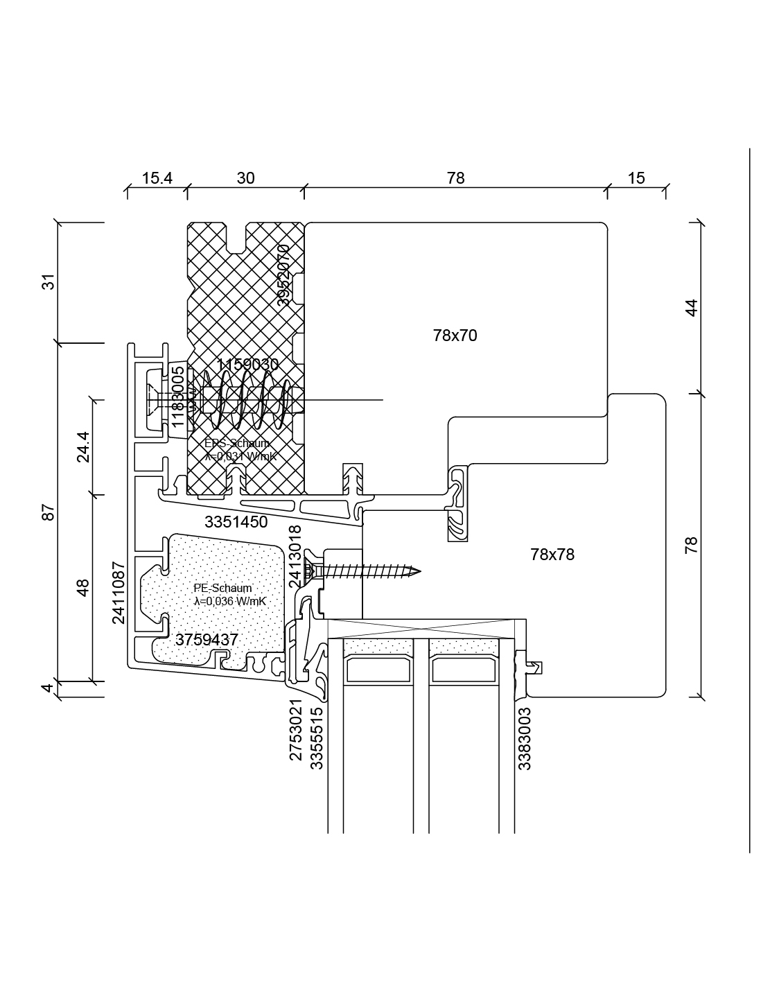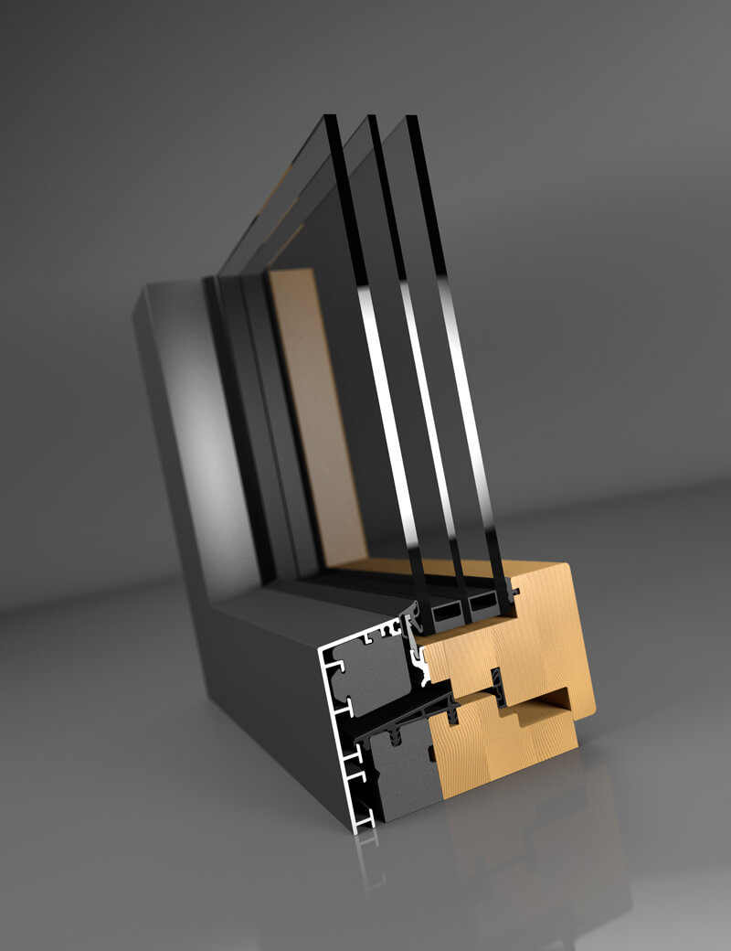 Passivhaus zertifizierte Konstruktion. Das Rahmenprofil verdeckt das Flügelprofil soweit, dass zwischen Festverglasungen und Öffnungselemente eine gleiche Rahmenansicht entsteht. Zwischen Glas und Flügelprofil besteht ein Versatz von 8 mm Tiefe. Die Konstruktion ist als Integralflügel oder Blockflügel definiert. Bei bestimmten statischen Anforderungen kann das Flügelprofil breiter ausgeführt werden. Die Entwässerung des Falzbereiches erfolgt durch verdeckte Stanzungen im unteren Profilquerstück des Rahmens. Optional kann eine sichtbare Entwässerung mit Abdeckkappe ausgeführt werden.